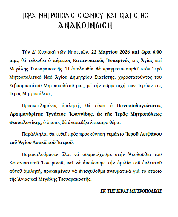 Ὁ Γ΄ Κατανυκτικὸς Ἑσπερινὸς στὸν Ἱερὸ Μητροπολιτικὸ Ναὸ Ἁγίου Δημητρίου Σιάτιστας.