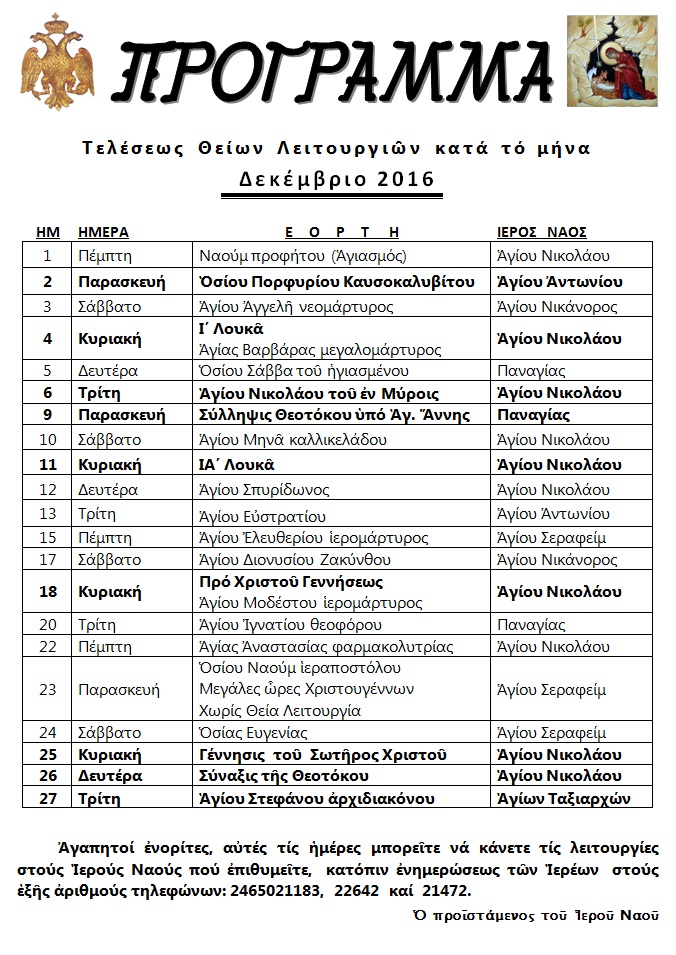 ΠΡΟΓΡΑΜΜΑ ΘΕΙΩΝ ΛΕΙΤΟΥΡΓΙΩΝ ΝΟΕΜΒΡΙΟΥ