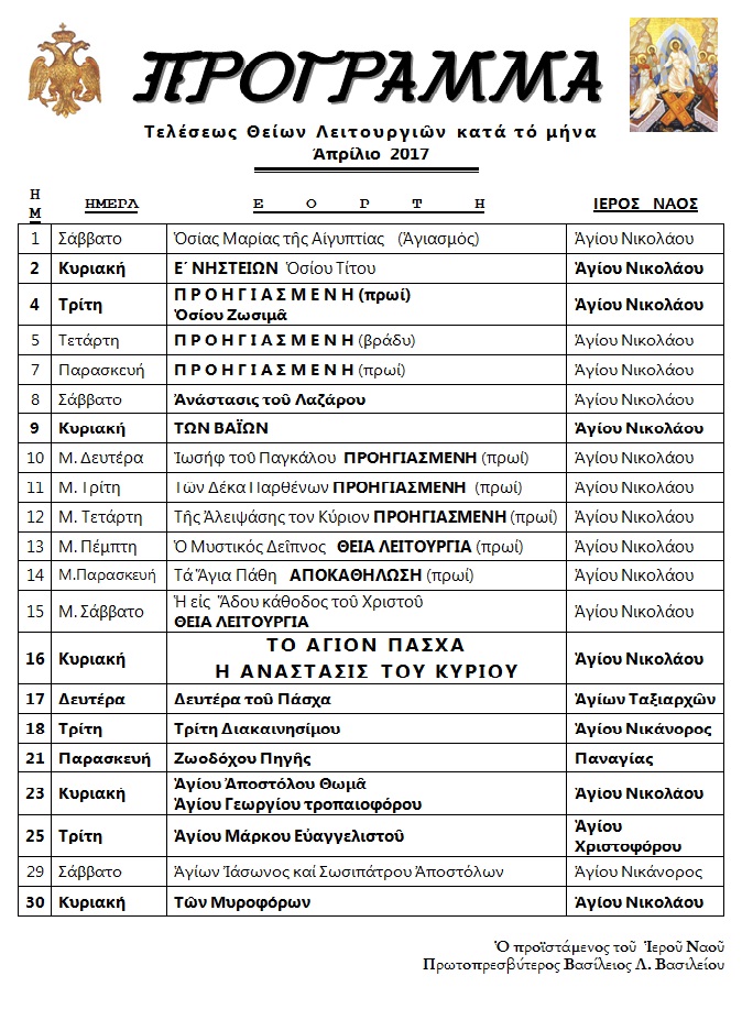 ΠΡΟΓΡΑΜΜΑ ΘΕΙΩΝ ΛΕΙΤΟΥΡΓΙΩΝ ΑΠΡΙΛΙΟΥ