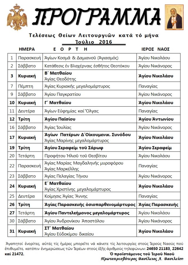 ΠΡΟΓΡΑΜΜΑ ΘΕΙΩΝ ΛΕΙΤΟΥΡΓΙΩΝ ΙΟΥΛΙΟΥ
