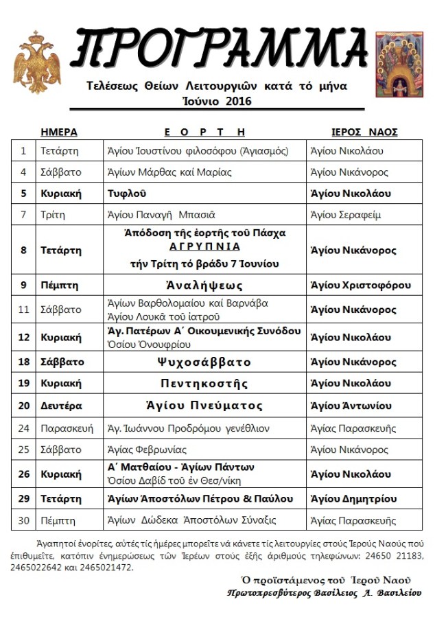 ΠΡΟΓΡΑΜΜΑ ΘΕΙΩΝ ΛΕΙΤΟΥΡΓΙΩΝ ΙΟΥΝΙΟΥ