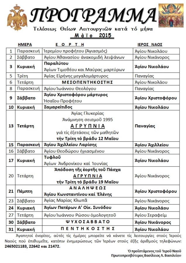 ΠΡΟΓΡΑΜΜΑ ΘΕΙΩΝ ΛΕΙΤΟΥΡΓΙΩΝ ΜΑΪΟΥ