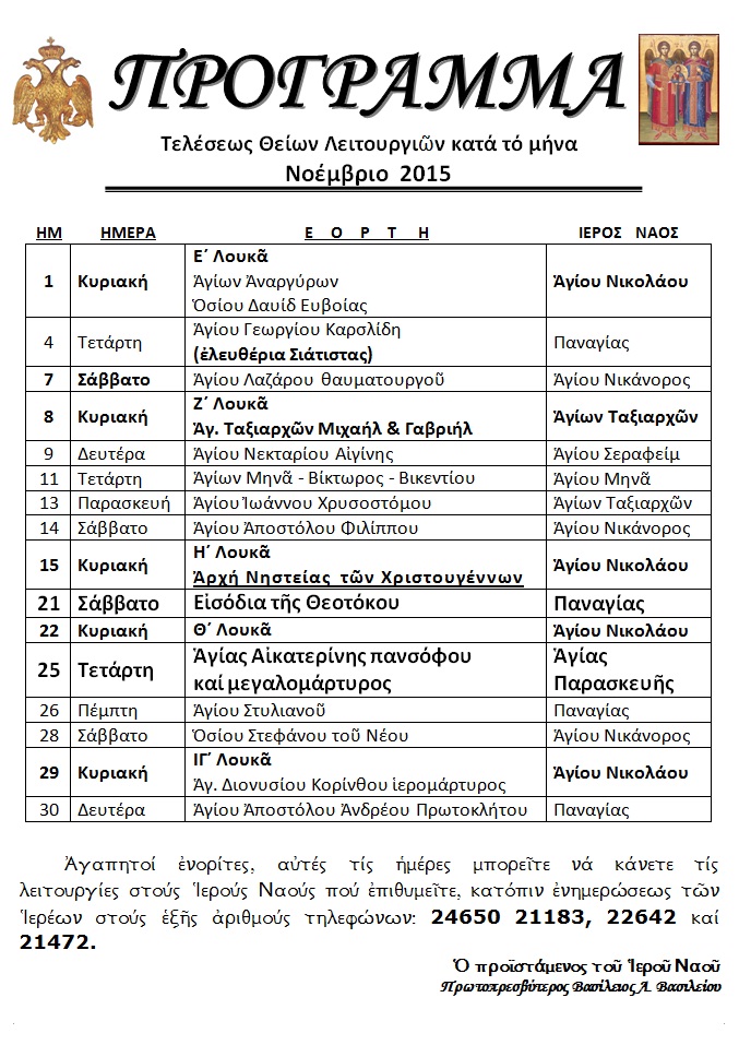 ΠΡΟΓΡΑΜΜΑ ΘΕΙΩΝ ΛΕΙΤΟΥΡΓΙΩΝ ΝΟΕΜΒΡΙΟΥ
