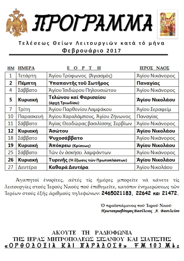 ΠΡΟΓΡΑΜΜΑ ΘΕΙΩΝ ΛΕΙΤΟΥΡΓΙΩΝ ΦΕΒΡΟΥΑΡΙΟΥ