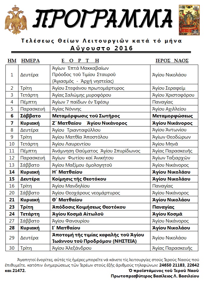 ΠΡΟΓΡΑΜΜΑ ΘΕΙΩΝ ΛΕΙΤΟΥΡΓΙΩΝ ΙΟΥΛΙΟΥ