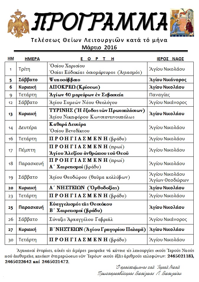 ΠΡΟΓΡΑΜΜΑ ΙΕΡΩΝ ΑΚΟΛΟΥΘΙΩΝ ΜΑΡΤΙΟΥ