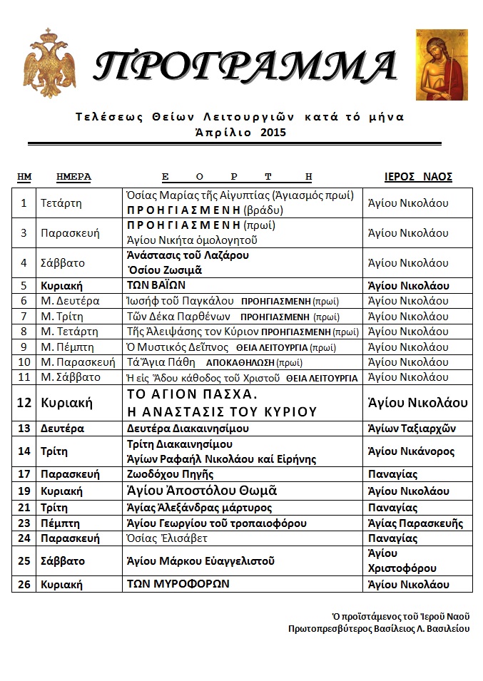 ΠΡΟΓΡΑΜΜΑ ΛΕΙΤΟΥΡΓΙΩΝ ΑΠΡΙΛΙΟΥ 2015