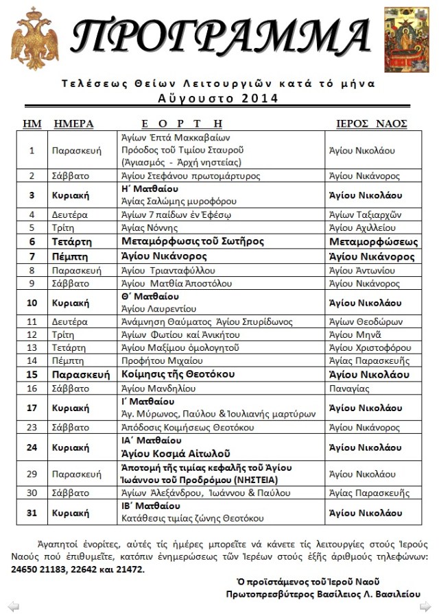 ΠΡΟΓΡΑΜΜΑ ΛΕΙΤΟΥΡΓΙΩΝ ΑΥΓΟΥΣΤΟΥ