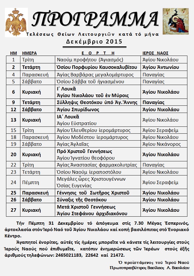 ΠΡΟΓΡΑΜΜΑ ΛΕΙΤΟΥΡΓΙΩΝ ΔΕΚΕΜΒΡΙΟΥ