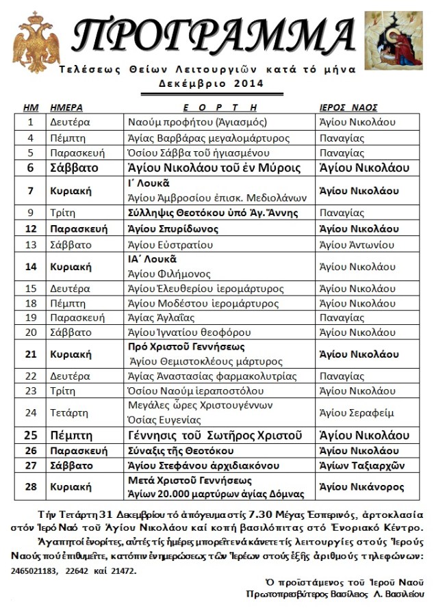 ΠΡΟΓΡΑΜΜΑ ΛΕΙΤΟΥΡΓΙΩΝ ΔΕΚΕΜΒΡΙΟΥ