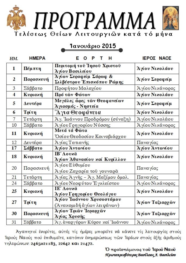 ΠΡΟΓΡΑΜΜΑ ΛΕΙΤΟΥΡΓΙΩΝ ΙΑΝΟΥΑΡΙΟΥ