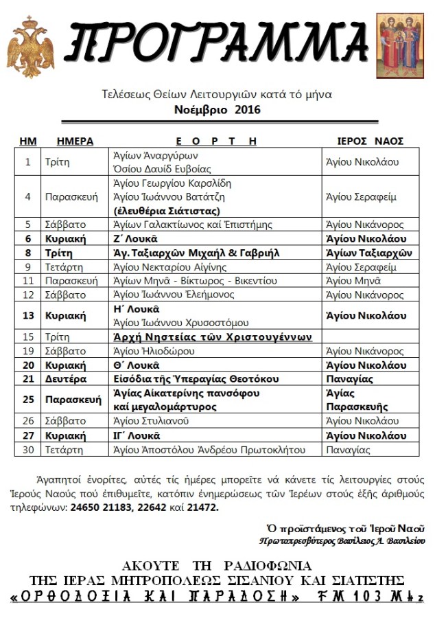 ΠΡΟΓΡΑΜΜΑ ΘΕΙΩΝ ΛΕΙΤΟΥΡΓΙΩΝ ΝΟΕΜΒΡΙΟΥ