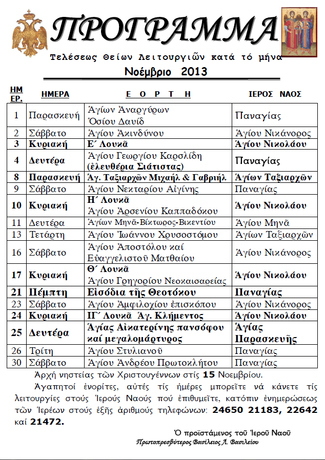 Πρόγραμμα Λειτουργιών Δεκεμβρίου 2013