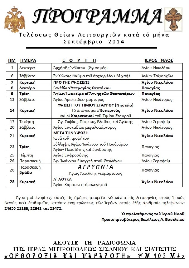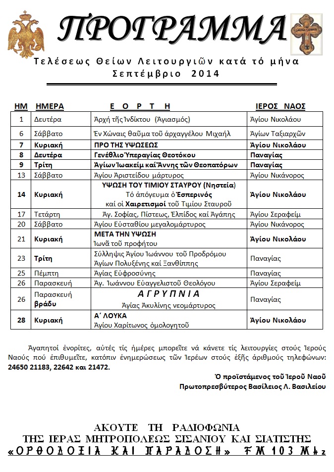 ΠΡΟΓΡΑΜΜΑ ΛΕΙΤΟΥΡΓΙΩΝ ΣΕΠΤΕΜΒΡΙΟΥ