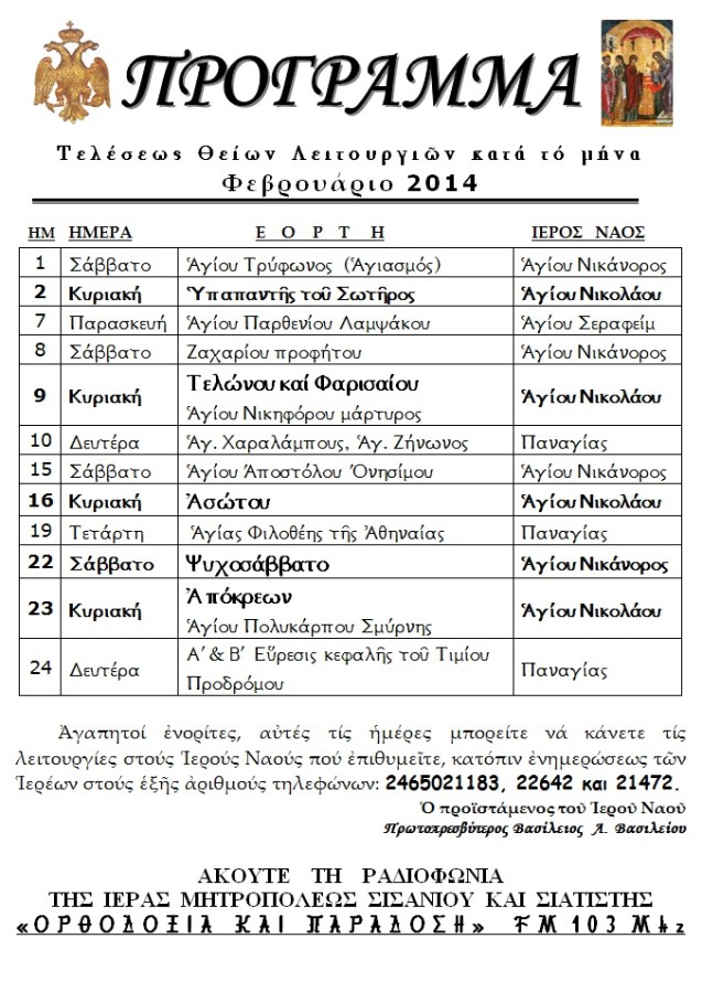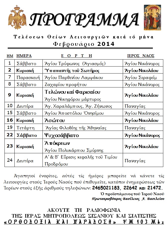 ΠΡΟΓΡΑΜΜΑ ΛΕΙΤΟΥΡΓΙΩΝ ΦΕΒΡΟΥΑΡΙΟΥ