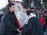 Ο Μητροπολίτης με τους Ιερείς, αφού ασπάσθηκαν την Εικόνα της Παναγίας, εν πομπή και με τη συνοδεία της Φιλαρμονικής του Δήμου, την μετέφεραν μέχρι τον Ιερό Ναό του Αγίου Νικολάου.