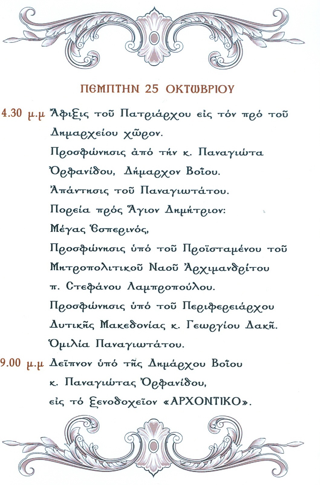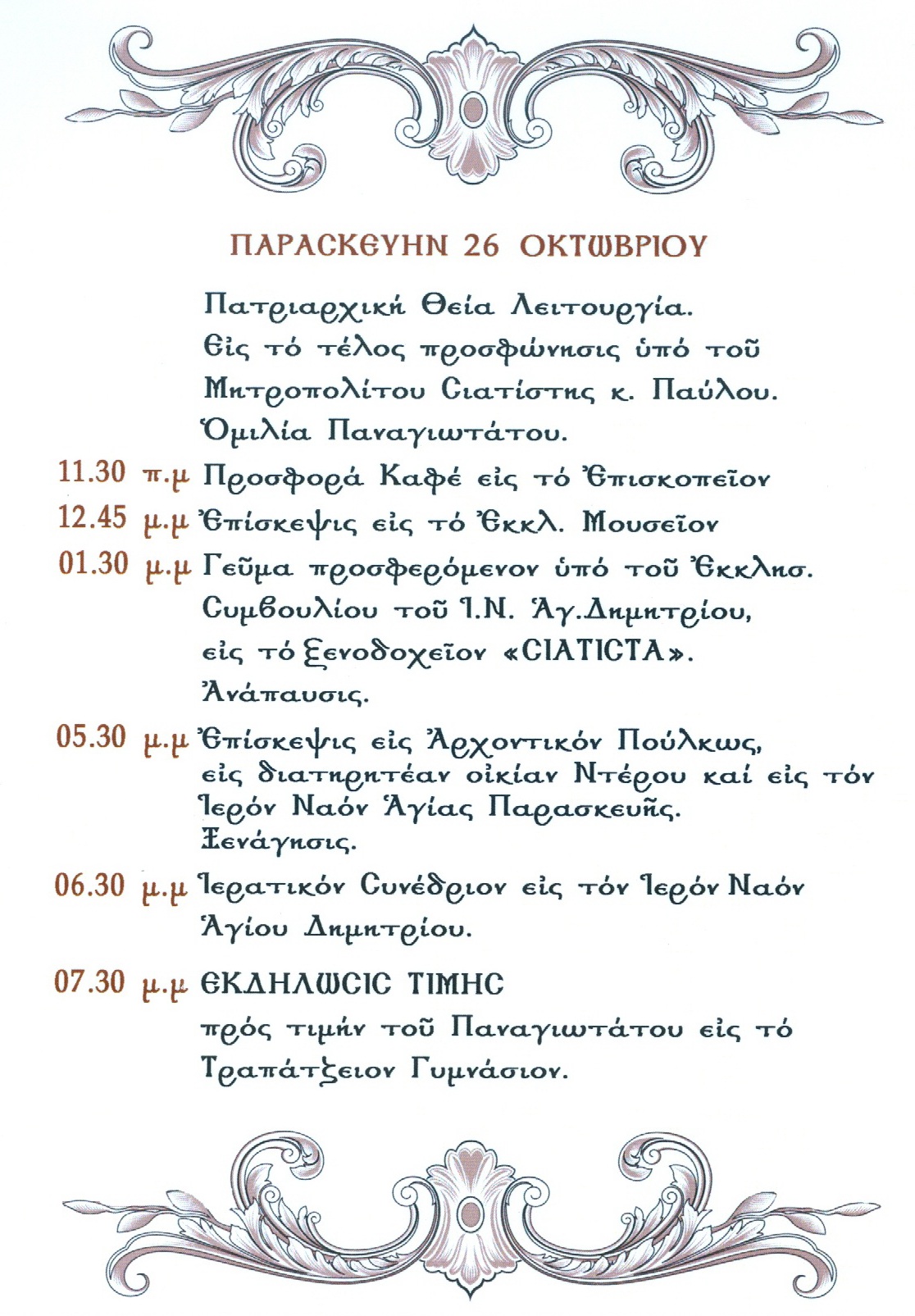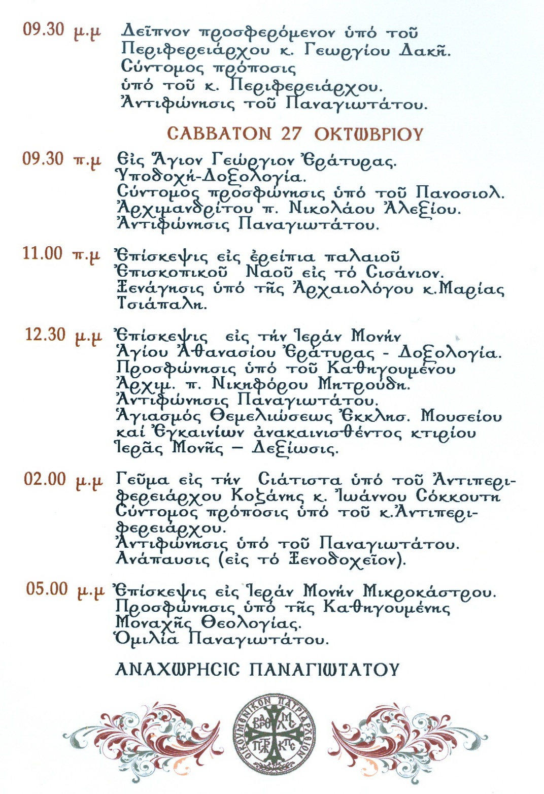 Τo αναλυτικό πρόγραμμα της επίσκεψης του Παναγιωτάτου Οικουμενικού Πατριάρχη κ. κ. Βαρθολομαίου, στην Μητρόπολη Σισανίου και Σιατίστης, από 25 έως 27 Οκτωβρίου έχει ως εξής: