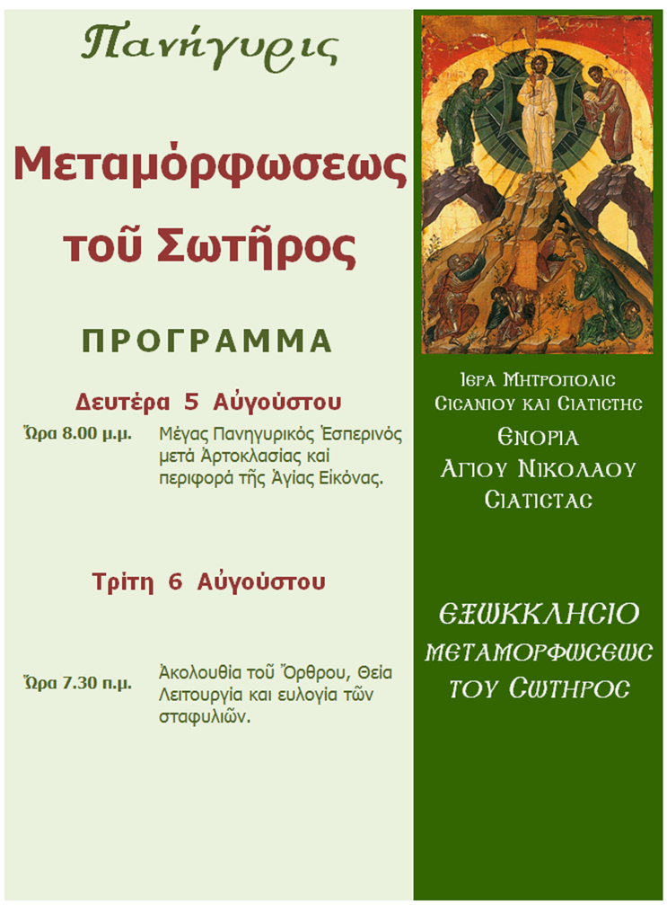 Ανακοίνωση – Πανήγυρις Μεταμορφώσεως του Σωτήρος