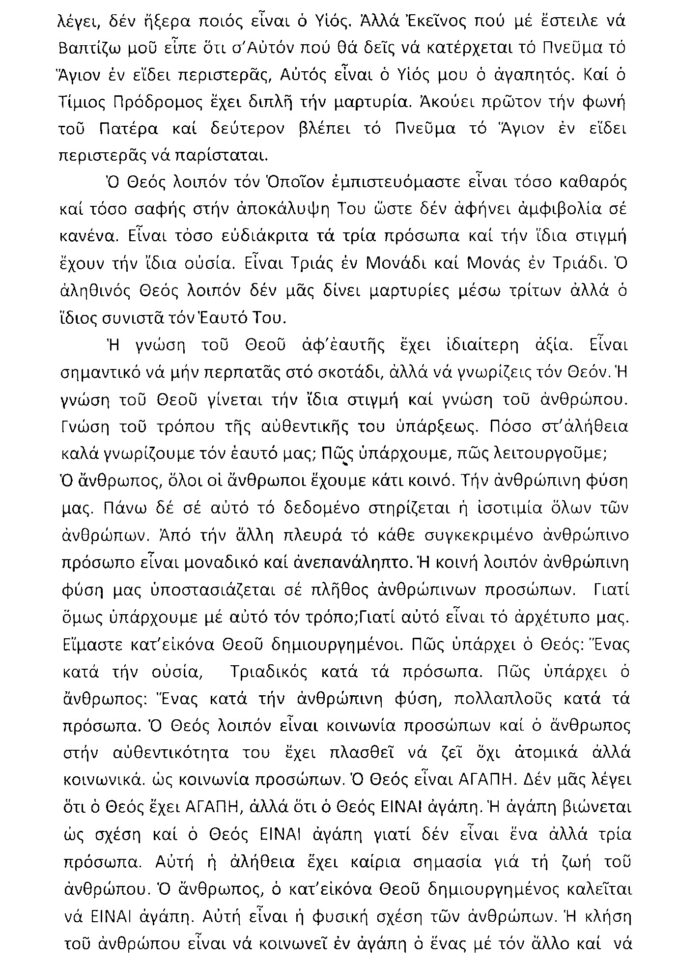 Και ένα ακόμα ερώτημα. Γιατί έχει τόση μεγάλη σημασία να γνωρίσουμε το Θεό; Διότι εμείς οι άνθρωποι είμαστε κατ’ εικόνα Θεού δημιουργημένοι. Γνωρίζοντας το Θεό, καταλαβαίνουμε ποιοι είμαστε εμείς. Ελάτε, λοιπόν, να δούμε ποιοι είμαστε εμείς. Τι είπαμε ότι έχει ο Θεός; Μία φύση. Τι έχουν όλοι οι άνθρωποι; Μία κοινή φύση, την ανθρώπινη. Είμαστε όλοι το ίδιο, άνθρωποι. Της αυτής ποιότητας είναι η ανθρώπινη φύση μας και γι’ αυτό όλοι οι άνθρωποι είναι ισότιμοι. Προσέξτε, δεν είπα τη λέξη ίσοι. Γιατί δεν είμαστε ίσοι. Είμαστε όμως ισότιμοι. Δηλαδή, κανείς δεν δικαιούται μεγαλύτερη τιμή από τον άλλον ως άνθρωπος. Απ’ την άλλη πλευρά, αυτή η μία ανθρώπινη φύση υπάρχει σ’ ένα πλήθος ανθρώπινων προσώπων. Έτσι, λοιπόν, ποιος είναι ο Θεός; Ένας κατά την ουσία, Τριαδικός κατά τα πρόσωπα. Ποιος είναι ο άνθρωπος; Ένας κατά την ουσία, πολλαπλούς κατά τα πρόσωπα. Τι είναι ο Θεός; Αγάπη. Τι είναι απ’ τη φύση του και τι πρέπει να είναι ο άνθρωπος; Αγάπη. Οι σχέσεις των ανθρωπίνων προσώπων πρέπει να χαρακτηρίζονται από την αγάπη. Αλλιώς ο άνθρωπος έχει ξεπέσει από την ανθρώπινη υπόστασή του. Να, λοιπόν, γιατί έχει μεγάλη σημασία να γνωρίσουμε το Θεό. Για να γνωρίσουμε τον άνθρωπο…