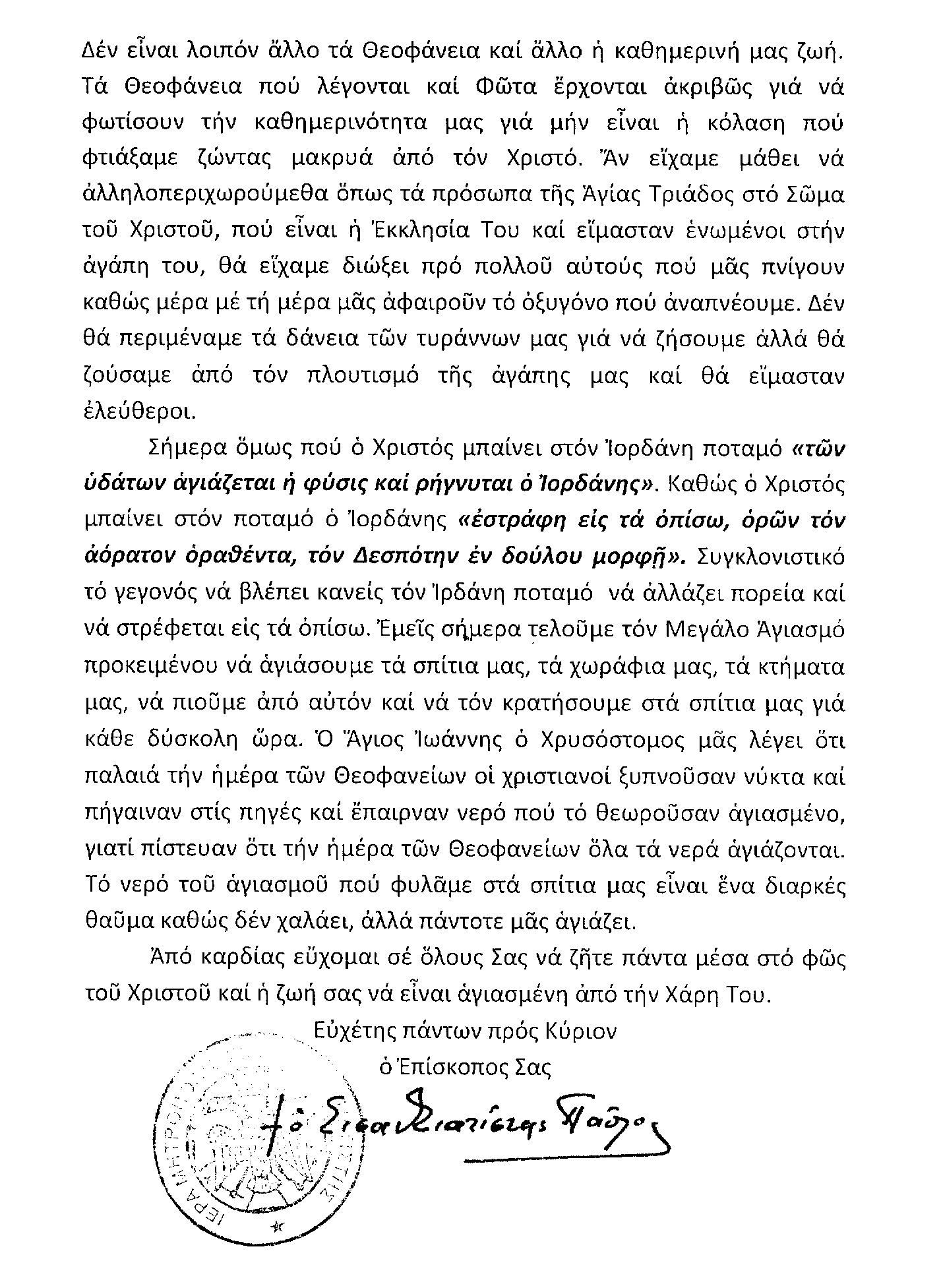 «…Ονομάζουμε την εορτή Θεοφάνεια, γιατί εδώ έρχεται ο ίδιος ο Θεός και συνιστά την ταυτότητά του. Έχουμε πάρα πολύ καθαρά την ξεχωριστή ύπαρξη των τριών προσώπων, που είναι ο ένας Θεός. Το πρώτο πρόσωπο είναι ο Υιός που έγινε άνθρωπος και τώρα έρχεται στον Ιορδάνη να βαπτιστεί. Το δεύτερο πρόσωπο είναι Εκείνος που ομιλεί και λέει: «Αυτός είναι ο Υιός μου ο αγαπητός εν ω ηυδόκησα Αυτού ακούετε». Είναι το πρόσωπο του Θεού Πατέρα, που αποκαλύπτει στους ανθρώπους ότι, αυτό το πρόσωπο που βλέπετε και είναι άνθρωπος, δεν είναι μόνον άνθρωπος, είναι ο μονογενής Υιός και Λόγος του Θεού, ο αγαπητός Υιός του Θεού. Και το Πνεύμα το Άγιο πάλι, ξεχωριστά έρχεται εν είδει περιστεράς.