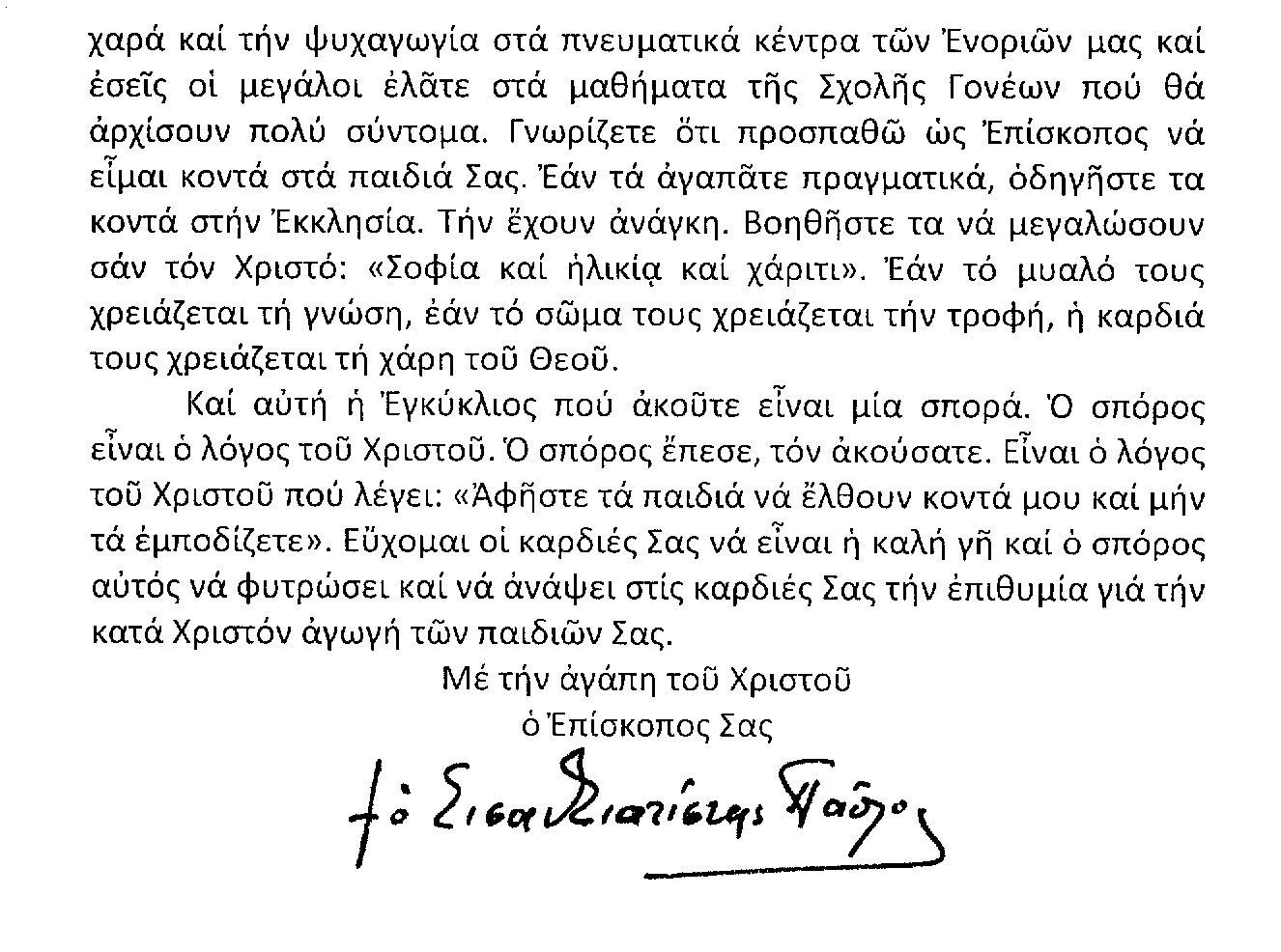 «Πριν λίγο, αγαπητά μου παιδιά, ακούσαμε σε μία ευχή του αγιασμού να παρακαλεί ο Ιερέας τον Άγιο Τριαδικό Θεό να έλθει το Άγιο Πνεύμα στους διδάσκοντες και διδασκομένους τον Λόγο του Θεού, ώστε να μας φωτίσει να μεταφέρουμε ορθά και να κατανοούμε ορθά και να τηρούμε ορθά το Λόγο του Θεού.