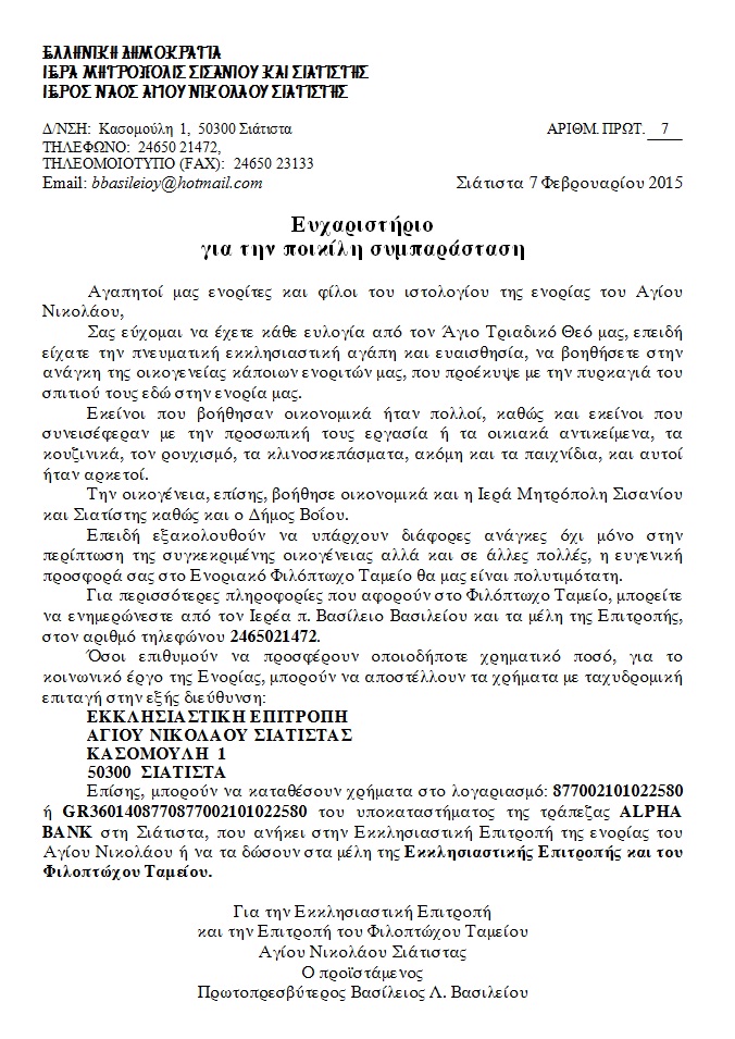 Η Ενορία του Αγίου Νικολάου ευχαριστεί όλους όσοι συμπαραστάθηκαν στο κάλεσμα για βοήθεια στην οικογένεια που κάηκε το σπίτι τους.
