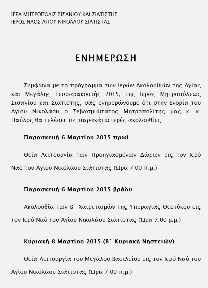 Ο Σεβασμιώτατος Μητροπολίτης Σισανίου και Σιατίστης κ. κ. Παύλος θα τελέσει τις παρακάτω Ιερές Ακολουθίες στην Ενορία του Αγίου Νικολάου