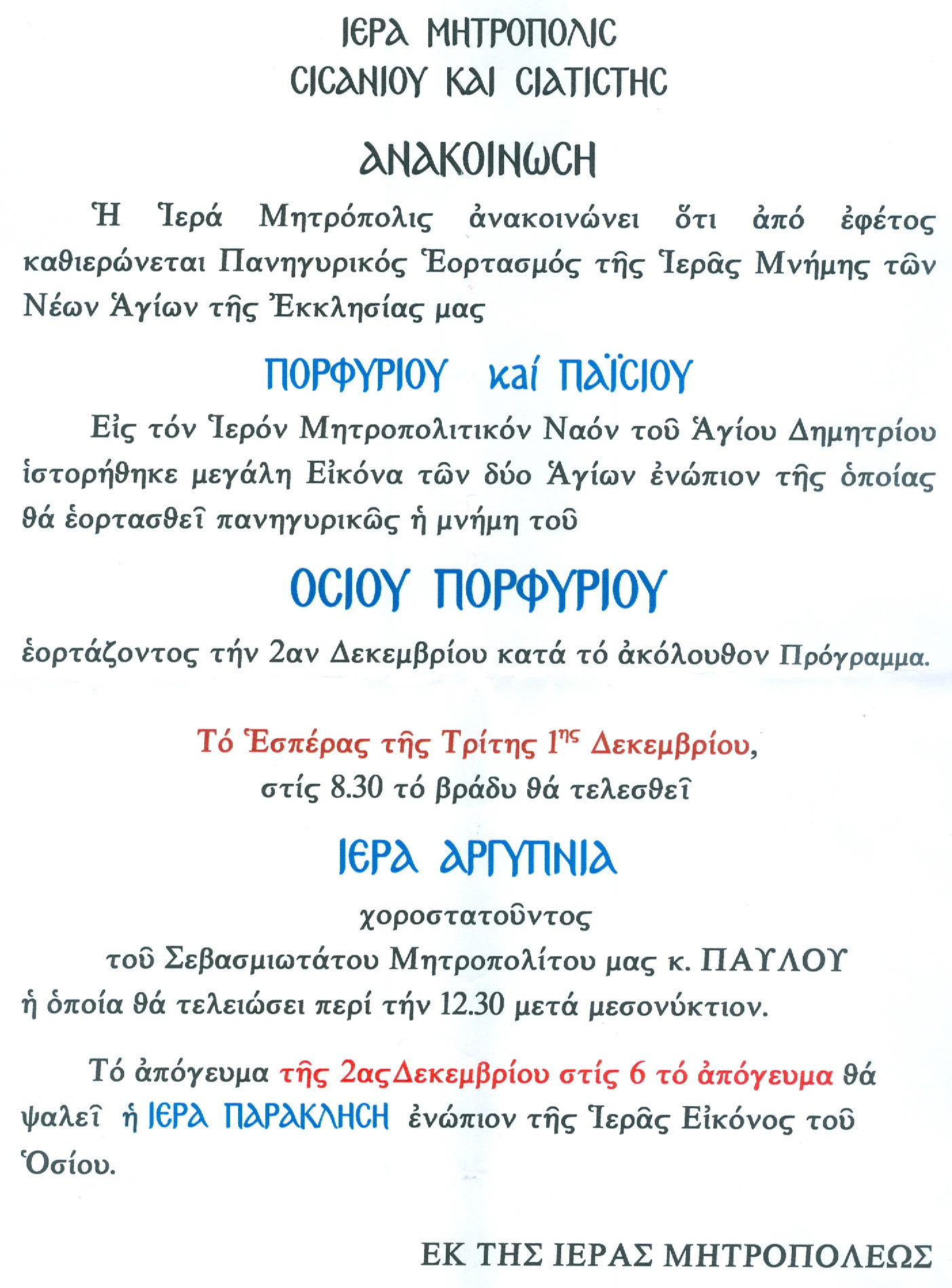 Πανηγυρικός εορτασμός της Ιεράς μνήμης Πορφυρίου και Παϊσίου των νέων Αγίων της Εκκλησίας μας