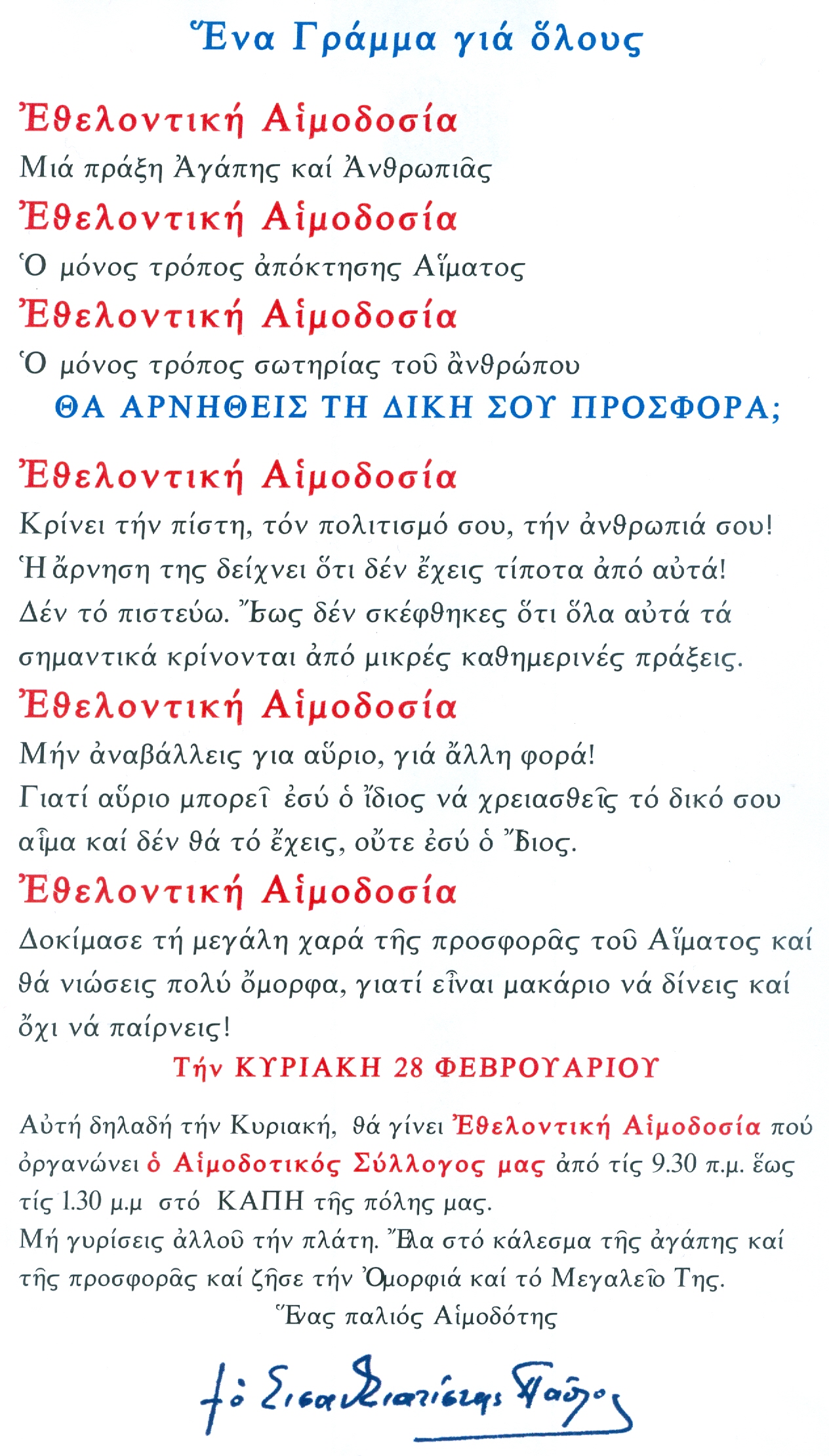 «Ένα Γράμμα για όλους περί Εθελοντικής Αιμοδοσίας» του Σεβασμιωτάτου Μητροπολίτου Σισανίου και Σιατίστης Παύλου