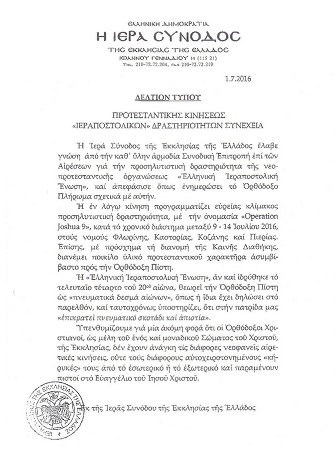 Η Ιερά Σύνοδος προειδοποιεί πάλι για την προσηλυτιστική δραστηριότητα της νεο-προτεσταντικής οργανώσεως «Ελληνική Ιεραποστολική Ένωση».