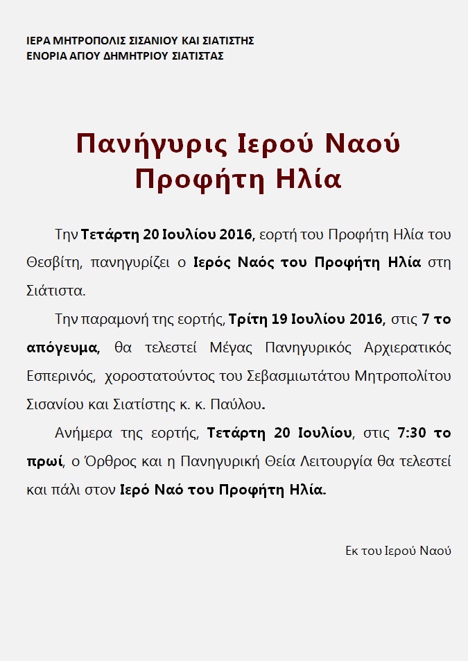 Πανήγυρις Ιερού Ναού Προφήτη Ηλία
