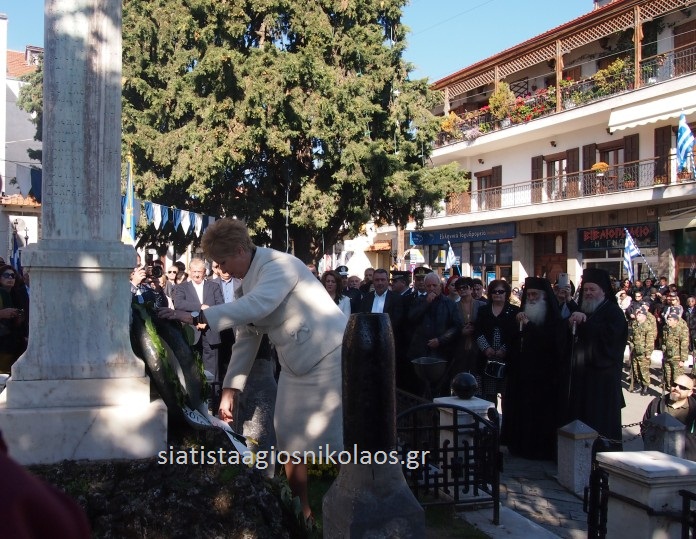 Στεφάνια κατέθεσαν η Υφυπουργός Μακεδονίας Θράκης κ. Μαρία Κόλλια Τσαρουχά η οποία εκπροσώπησε την κυβέρνηση, ο κ. Γεώργιος Τζιμάνης, ο οποίος εκπροσώπησε επίσημα τη Βουλή των Ελλήνων, εκπρόσωπος από την περιφέρεια Δυτικής Μακεδονίας, ο Δήμαρχος Βοΐου κ. Δημήτριος Λαμπρόπουλος, ο Πρόεδρος τοπικού Συμβουλίου Σιάτιστας κ. Στέργιος Δίκος, ο Διοικητής της Διοίκησης Επιστρατεύσεως του Γ.Σ.Σ., Ταξίαρχος κ. Ιωάννης Προκόπης, εκπρόσωπος της Ελληνικής Αστυνομίας, ο Γενικός Αστυνομικός Διευθυντής Περιφέρειας Δυτικής Μακεδονίας κ. Παναγιώτης Τζιοβάρας, ο Διοικητής Αστυνομικού Τμήματος Σιάτιστας κ. Σωκράτης Δημόπουλος, Περιφερειακή Διεύθυνση Πυροσβεστικών Υπηρεσιών Δ. Μακεδονίας ο υποδιοικητής Αντιπύραρχος κ. Κωνσταντίνος Μαυροματίδης, Περιφερειακός Διευθυντής Εκπαίδευσης Δυτικής Μακεδονίας κ. Κωνσταντίνος Κωνσταντόπουλος, Εκπρόσωπος της Νέας Δημοκρατίας, η Βουλευτής Ν. Καστοριάς κ. Μαρία Αντωνίου, Εκπρόσωποι από την Παγκρήτιο Ένωση, την Ομοσπονδία Σωματείων Αποκορώνου, από το Σύλλογο Βαμιανών Αττικής, από το Σύλλογο Αρμενιανών Αττικής, από το Σύλλογο Φρεδιανών Αττικής, από το Δήμο Πλατανιάς, από το Σύλλογο Κισσαμιτών Αττικής, της Εθνικής αντίστασης Σιάτιστας και εκ μέρους των Συλλόγων Σιατιστέων Θεσσαλονίκης και Αθηνών αντίστοιχα ο κ. Γεώργιος Δέμπας και η κ. Σουλτάνα Κωνσταντινίδου.