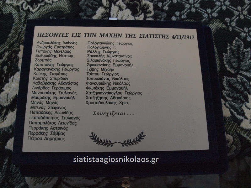Σ’ αυτό το μέρος, πριν 104 χρόνια, έγινε η μεγάλη και ιστορική μάχη της Σιάτιστας στις 4 Νοεμβρίου 1912. Ο στρατηγός Νικόλαος Κλαδάς, διοικητής της πυροβολαρχίας κατά τη μάχη της 4ης Νοεμβρίου 1912, γράφει τα εξής «Στις πολεμικές του αναμνήσεις»: «Η μάχη της Σιατίστης είναι μοναδική εις το είδος της κατά τους Βαλκανικούς πολέμους και η νικηφόρος έκβασις τα μέγιστα συνετέλεσεν όχι μόνον εις την σωτηρίαν της πόλεως Σιατίστης και των εν αυτή καταφυγόντων πολλών χιλιάδων προσφύγων γυναικοπαίδων, αλλά και εις την έγκαιρον προέλασιν του Ελληνικού στρατού προς κατάληψιν της Θεσσαλονίκης. Ο Ελληνικός στρατός εξησφάλισε και εμονιμοποίησε την ελεθευρία της Σιατίστης, αλλά δεν απελευθέρωσε υπό την καθαράν σημασίαν του στρατιωτικού όρου, καθ’ όσον η ενθουσιώδης αυτή πόλις απηλευθερώθη μόνη της».