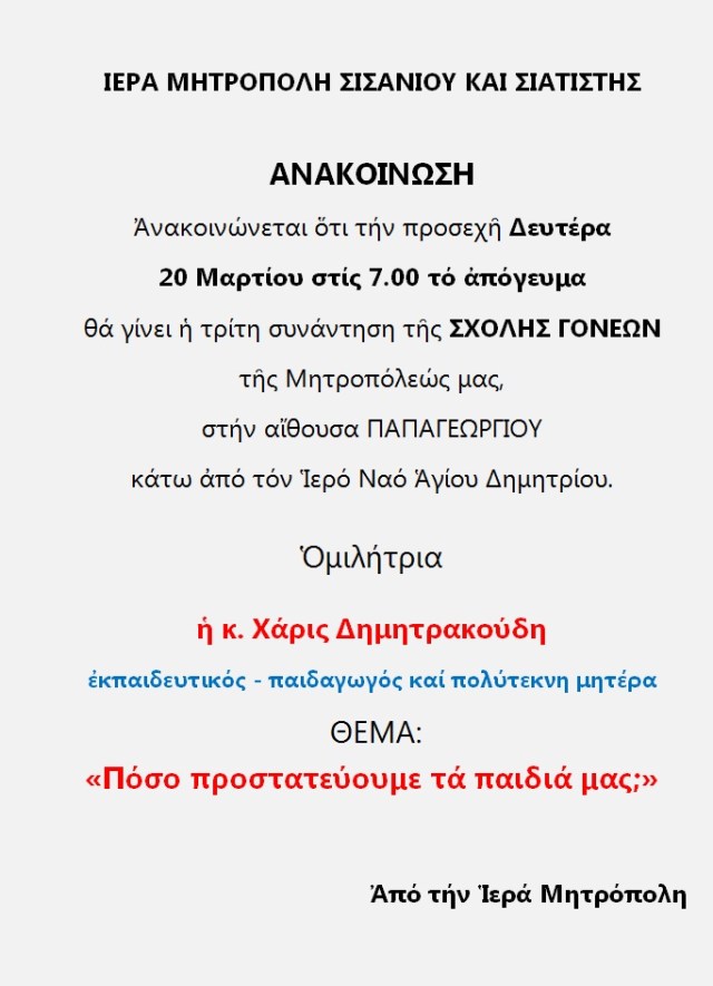 Σχολή Γονέων Ιεράς Μητροπόλεως Σισανίου και Σιατίστης