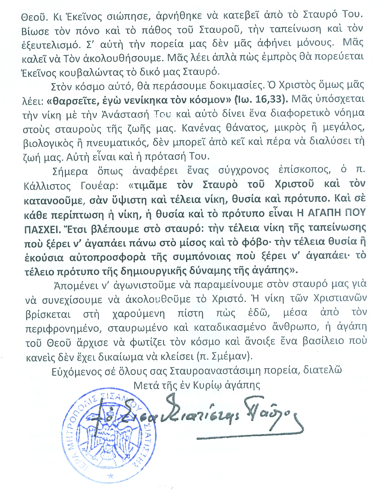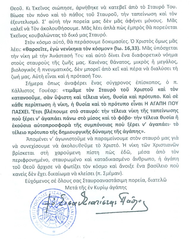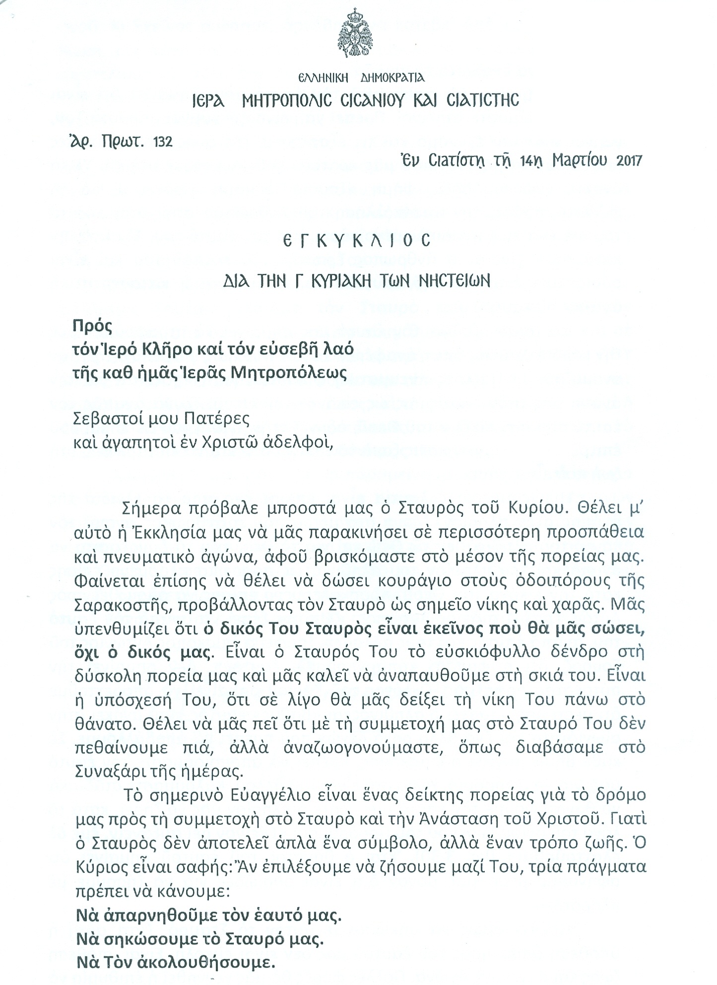 Εγκύκλιος «Επί τη Γ΄ Κυριακή των Νηστειών» του Σεβασμιωτάτου Μητροπολίτου Σισανίου και Σιατίστης κ.κ. Παύλου