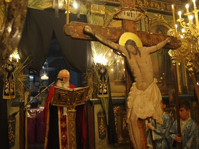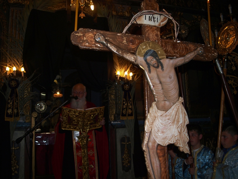 «Τῇ Ἁγίᾳ καί Μεγάλῃ Παρασκευῇ τά ἅγια καί σωτήρια καί φρικτά Πάθη τοῦ Κυρίου καί Θεοῦ καί Σωτῆρος ἡμῶν Ἰησοῦ Χριστοῦ ἐπιτελοῦμεν. τούς ἐμπτυσμούς, τά ‘ραπίσματα, τά κολαφίσματα, τάς ὕβρεις, τούς γέλωτας, τήν πορφυρᾶν χλαίναν, τόν κάλαμον, τόν σπόγγον, τό ὄξος, τούς ἥλους, τήν λόγχην καί πρό πάντων τόν σταυρόν καί τόν θάνατον, ἅ δι’ ἡμᾶς ἑκών κατεδέξατο. ἔτι δέ καί τήν τοῦ εὐγνώμονος λῃστοῦ, τοῦ συσταυρωθέντος αὐτῶ, σωτήριον ἐν τῷ σταυρῷ ὁμολογίαν».