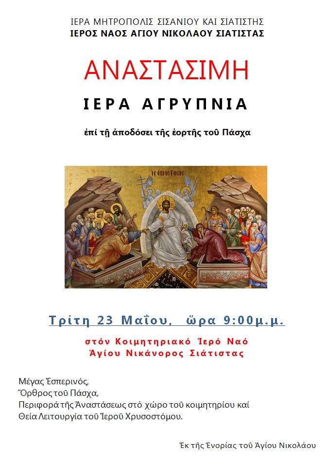 Αναστάσιμη Ιερά αγρυπνία επί τη αποδόσει της εορτής του Πάσχα
