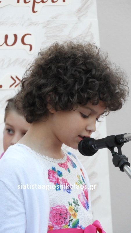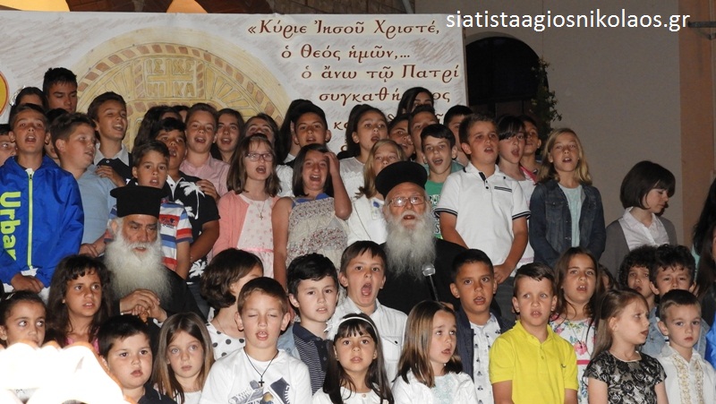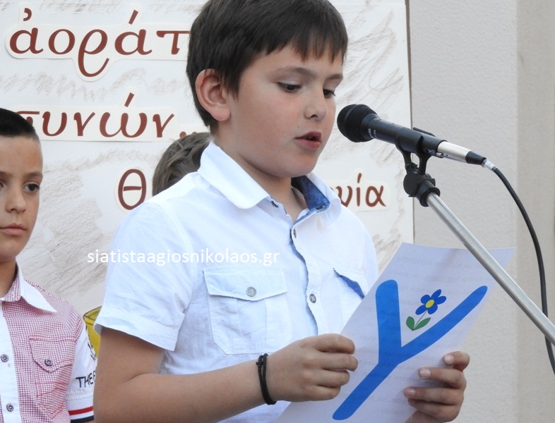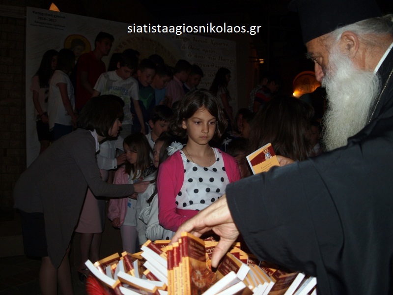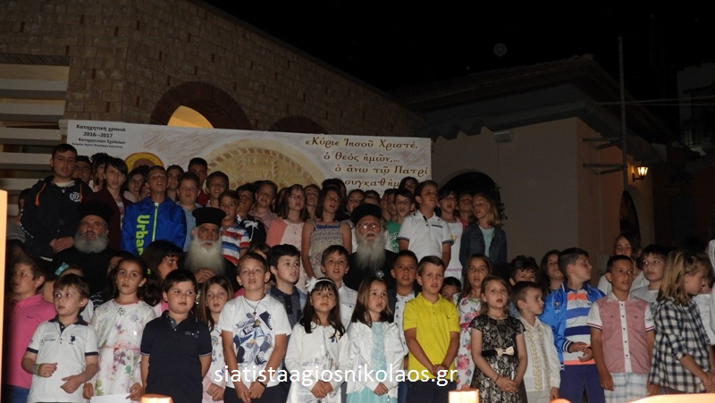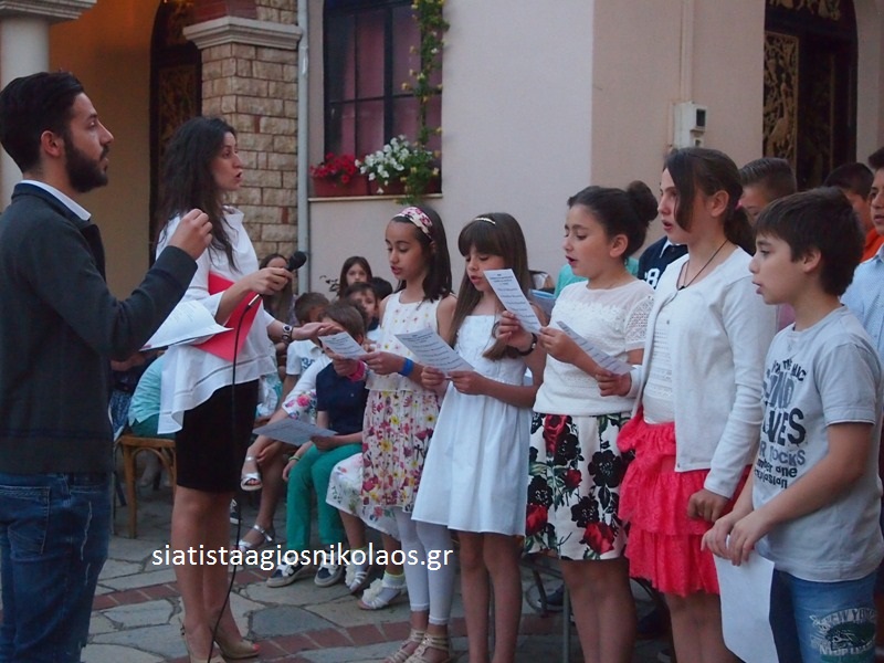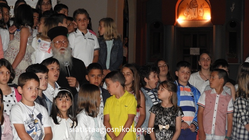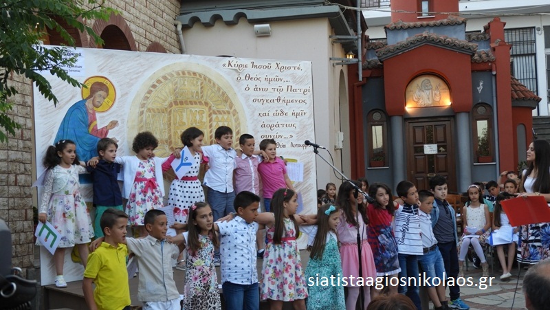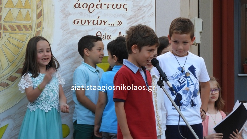 Η κατηχήτρια Μαλαματή Ζιώγου, δασκάλα, με τα παιδιά των τάξεων Δευτέρας και Τρίτης Δημοτικού, παρουσίασε αυτό που έκαναν, όπως είπε, και στα μαθήματα των κατηχητικών. Εύρισκαν από ένα γράμμα της Αλφαβήτου, που τους θύμιζε κάτι από το βίο του Αγίου που άκουγαν. Κατόπιν όλα μαζί τα παιδιά, με μια φωνή, φώναξαν το σύνθημα που είχαν όλη τη χρονιά: «Άγιοι, ακούστε τη φτωχή φωνή μου, γίνεται για πάντα πιστοί οδηγοί μου. Απλώστε χαρά, απλώστε ειρήνη, είστε το φως σ’ ένα κόσμο που δύει. Η παρουσία σας θα μας αλλάξει, η προσευχή σας θα μας ανεβάσει στον ουρανό», και αποχαιρέτησαν όλους με το τραγούδι τους, «Θέλω να γίνω Άγιος»