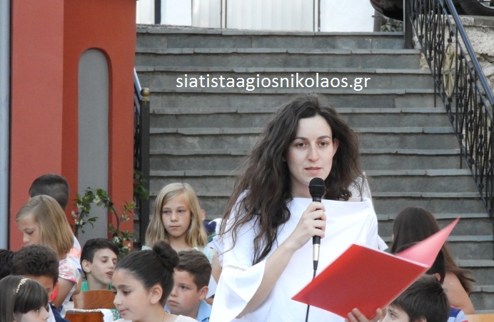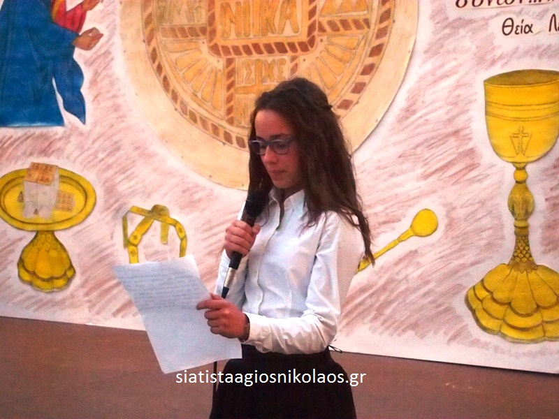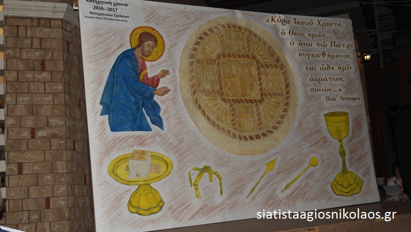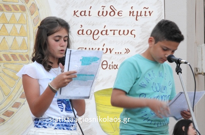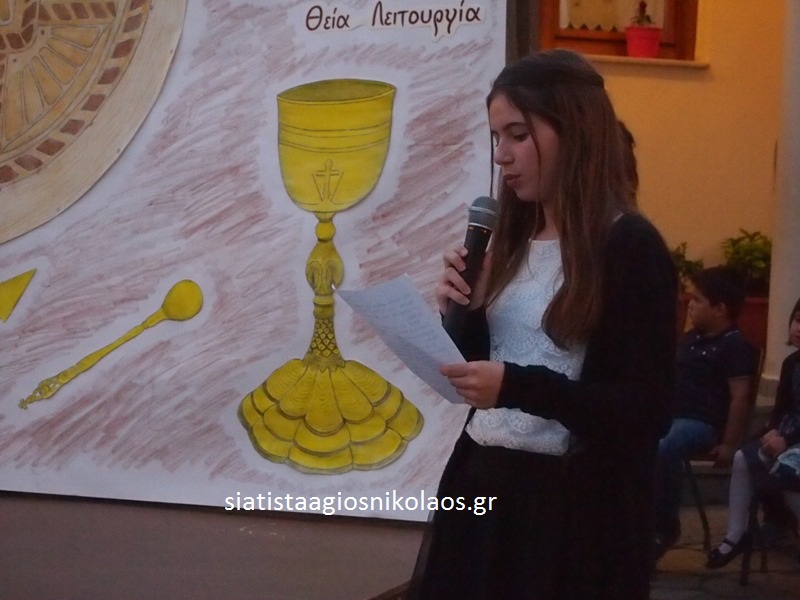 Η κατηχήτρια Περιστέρα Μάνιου, δασκάλα, παρουσίασε μια διαφορετική γιορτή. Εκτός από τα ποιήματα και τα τραγούδια που ακούστηκαν από τα παιδιά των τάξεων της Δ΄, Ε΄και Στ΄ Δημοτικού, παίχτηκε και ένα μικρό θεατρικό, το οποίο έγραψε η ίδια, με θέμα τη «Θεία Λειτουργία», που δίδαξε όλη τη χρονιά.