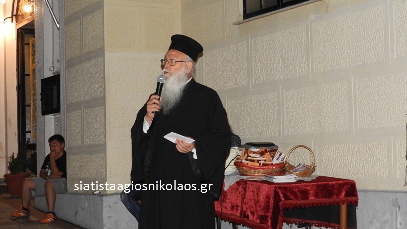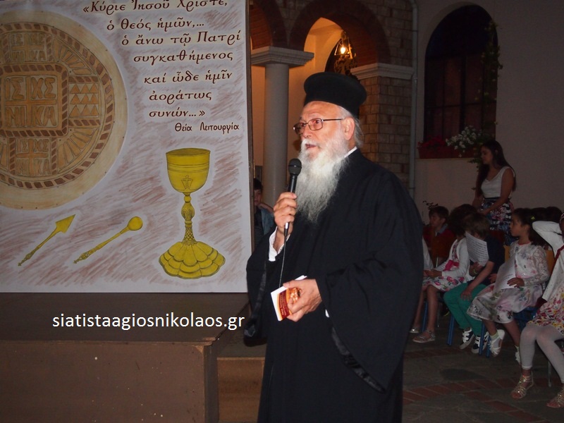 Ο π. Βασίλειος, ο υπεύθυνος των κατηχητικών συνάξεων της Ενορίας και κατηχητής, αφού ευχαρίστησε τον Σεβασμιώτατο Μητροπολίτη Σισανίου και Σιατίστης κ.κ. Παύλο, ανέφερε ότι, «η ενότητά μας και η δύναμή μας, αλλά και η αντίστασή μας στις λυσσαλέες επιθέσεις του «κόσμου», (που πίσω από τον «κόσμο», την πνευματική έννοια, βρίσκεται ο διάβολος), είναι η Θεία Λειτουργία. Αυτό, αγαπητά μου παιδιά, μη μας διαφεύγει. Η Θεία Λειτουργία είναι η ενότητα, η δύναμη και η αντίσταση. Ας είμαστε κοντά στην Εκκλησία, μέσα στο μυστήριο της Θείας Λειτουργίας και στην τακτική Θεία Κοινωνία».