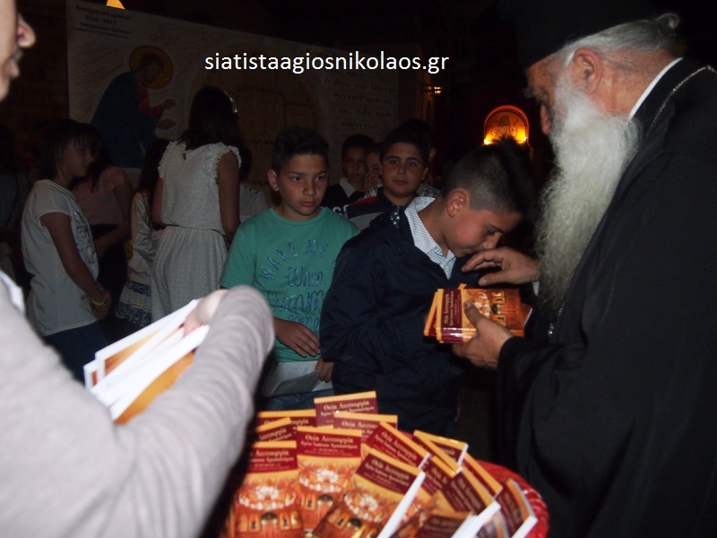 Στο τέλος της εορτής δόθηκε ως δώρο, από ένα βιβλιαράκι με τη Θεία Λειτουργία του Αγίου Ιωάννου του Χρυσοστόμου με μετάφραση του μακαριστού Παναγιώτη Τρεμπέλα, σε όλα τα παιδιά από το Δημοτικό μέχρι και τους νέους του Λυκείου, για να το φέρνουν στην Εκκλησία και να παρακολουθούν τη Θεία Λειτουργία.