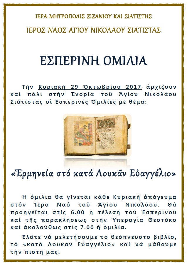 Εσπερινές Ομιλίες στον Ιερό Ναό του Αγίου Νικολάου Σιάτιστας