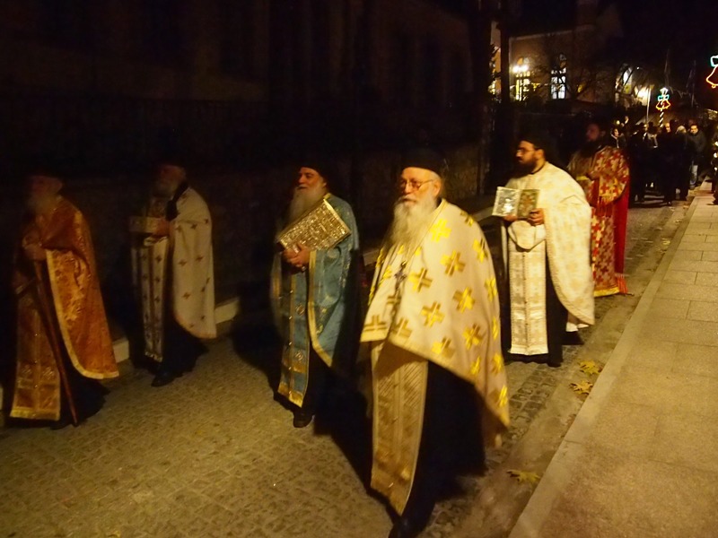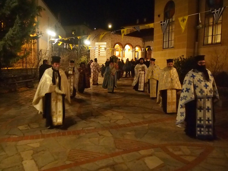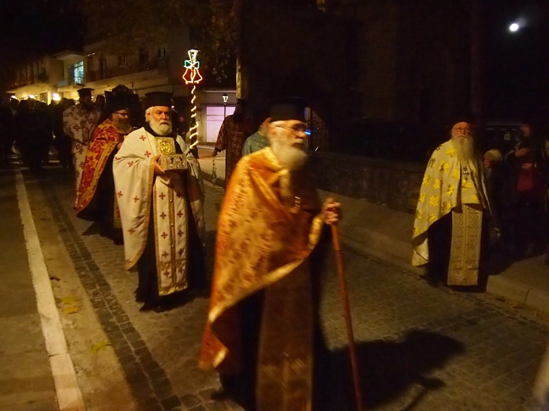 Μετά σχηματίστηκε πομπή, όπου λιτανευτικά με την παράταξη των Ιεροπαίδων αλλά και με τους ήχους της φιλαρμονικής του Δήμου, κατευθύνθηκαν όλοι προς τον πανηγυρίζοντα Ιερό Ναό του Αγίου Νικολάου, όπου τελέσθηκε ο πανηγυρικός αρχιερατικός εσπερινός.