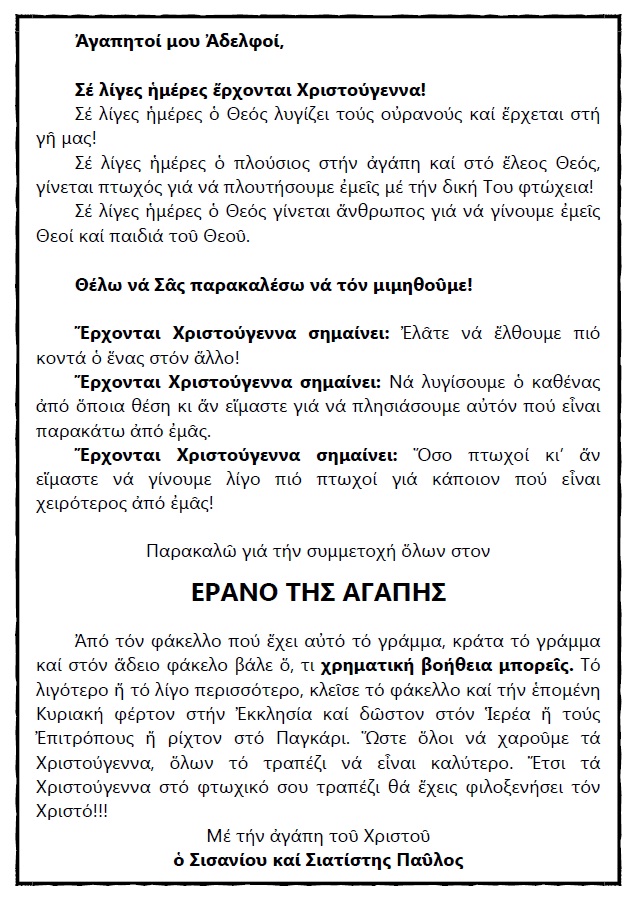 «Ελάτε να έλθουμε πιο κοντά ο ένας στον άλλο»! σημειώνει ο Σεβασμιώτατος Μητροπολίτης Σισανίου και Σιατίστης κ.κ. Παύλος στο εγκύκλιο σημείωμά του για τον Έρανο της Αγάπης, που θα διεξαχθεί μέχρι 20 Δεκεμβρίου 2017.