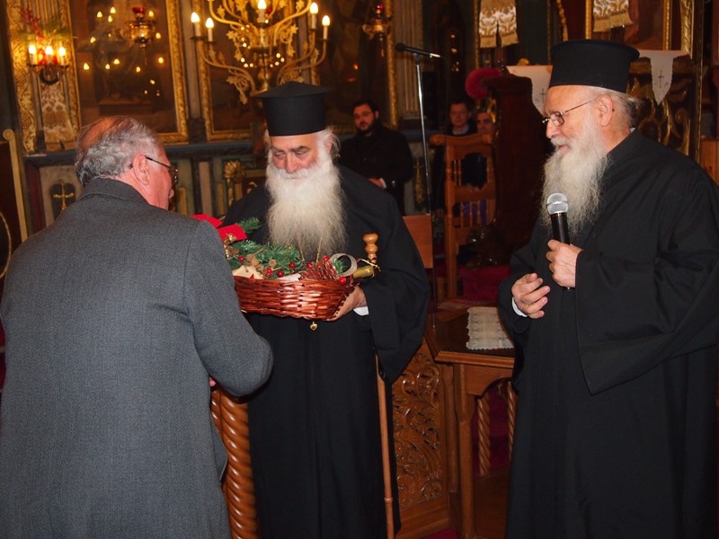 Στη συνέχεια ο πρωτοπρεσβύτερος Βασίλειος Βασιλείου παρακάλεσε τον Σεβασμιώτατο κ. Παύλο να προσφέρει τα δώρα στον κ. Αναστάσιο Δάρδα, στον κ. Ιωάννη Λιάκο και στον κ. Κωνσταντίνο Παπανικολάου, τα οποία καλλιτέχνησαν κυρίες της ενορίας.