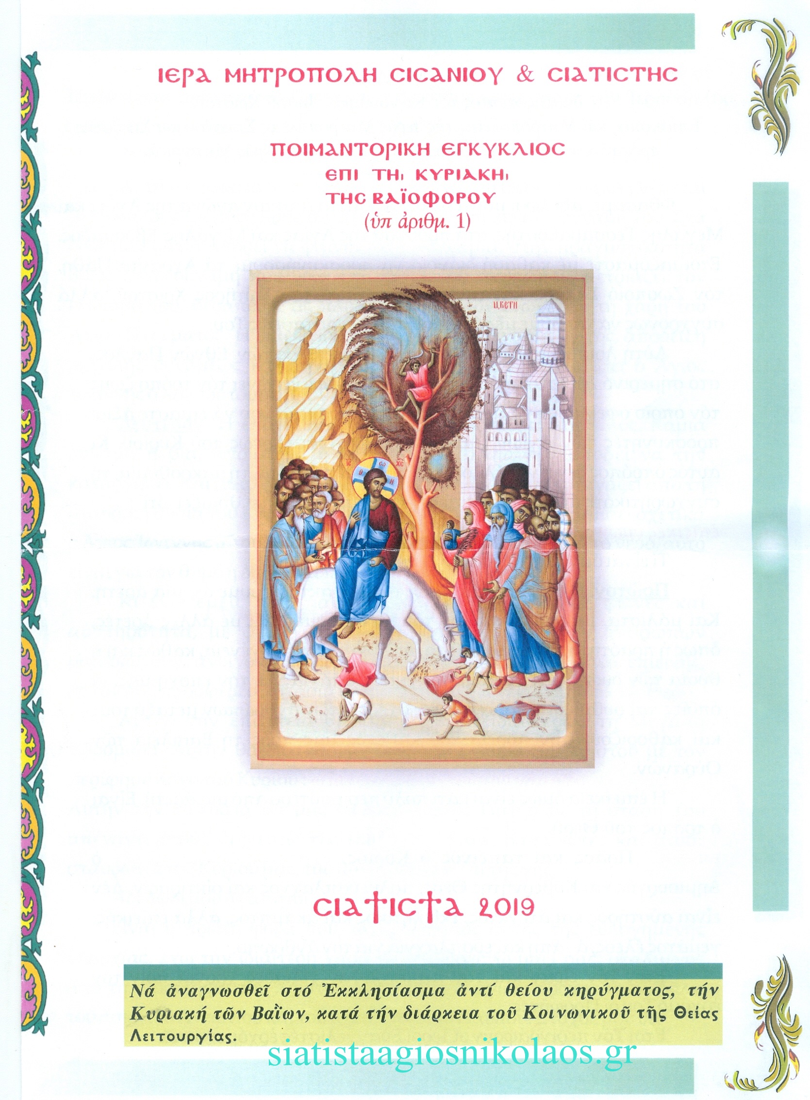 Ἐγκύκλιος Ποιμαντορική ἐπί τῇ Κυριακῇ τῆς Βαϊοφόρου.