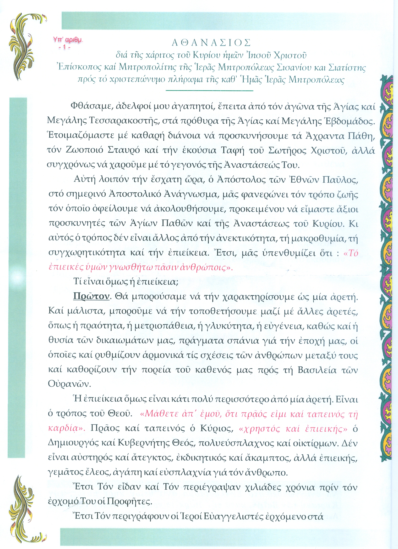 Ἐγκύκλιος Ποιμαντορική ἐπί τῇ Κυριακῇ τῆς Βαϊοφόρου.