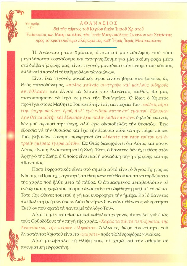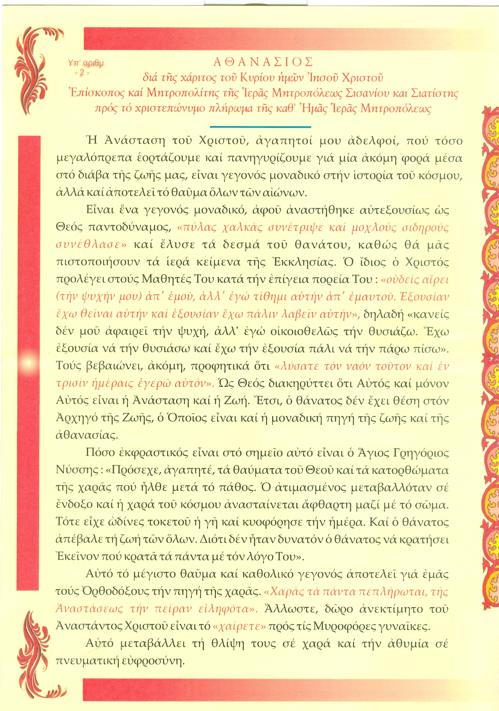 Ἐγκύκλιος ἐπί τῇ Ἁγία καί Μεγάλη Κυριακῇ του Πάσχα.