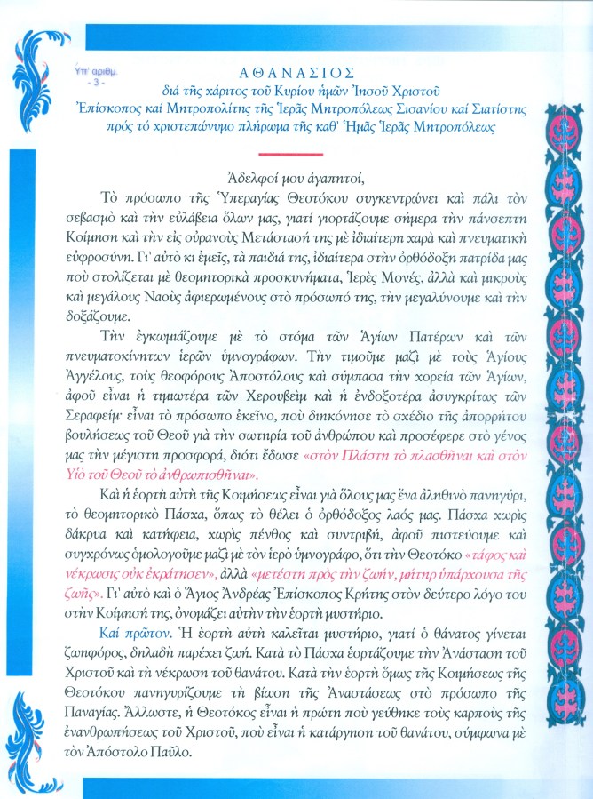 Ἐγκύκλιος ἐπί τῇ Θεομητορική ἑορτή τῆς Κοιμήσεως τῆς Ὑπεραγίας Θεοτόκου.