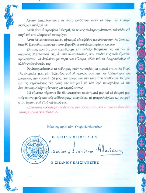 Ἐγκύκλιος ἐπί τῇ Θεομητορική ἑορτή τῆς Κοιμήσεως τῆς Ὑπεραγίας Θεοτόκου.